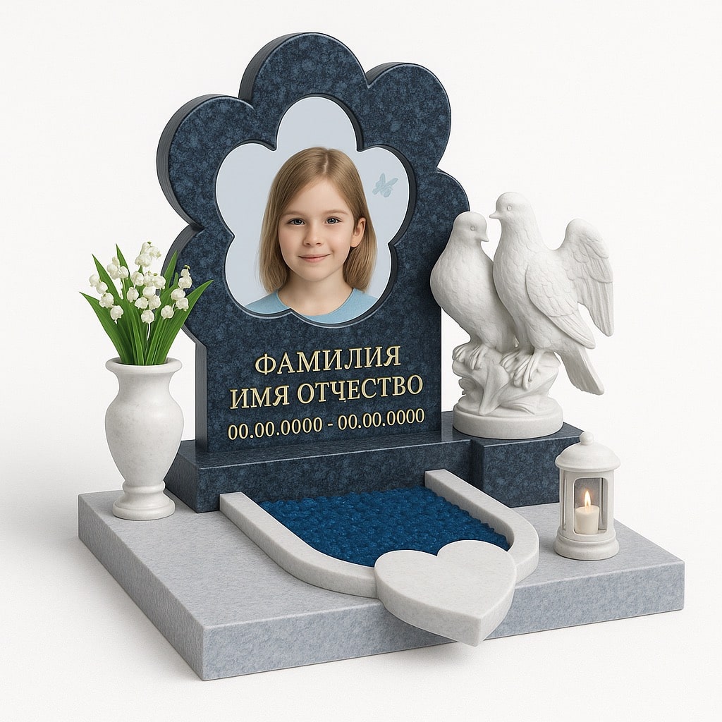 Светлый и трогательный памятник для ребёнка, выполненный в сочетании норвежского гранита Blue Pearl и белого камня, гармонично объединяет символику, изящество и современные технологии.