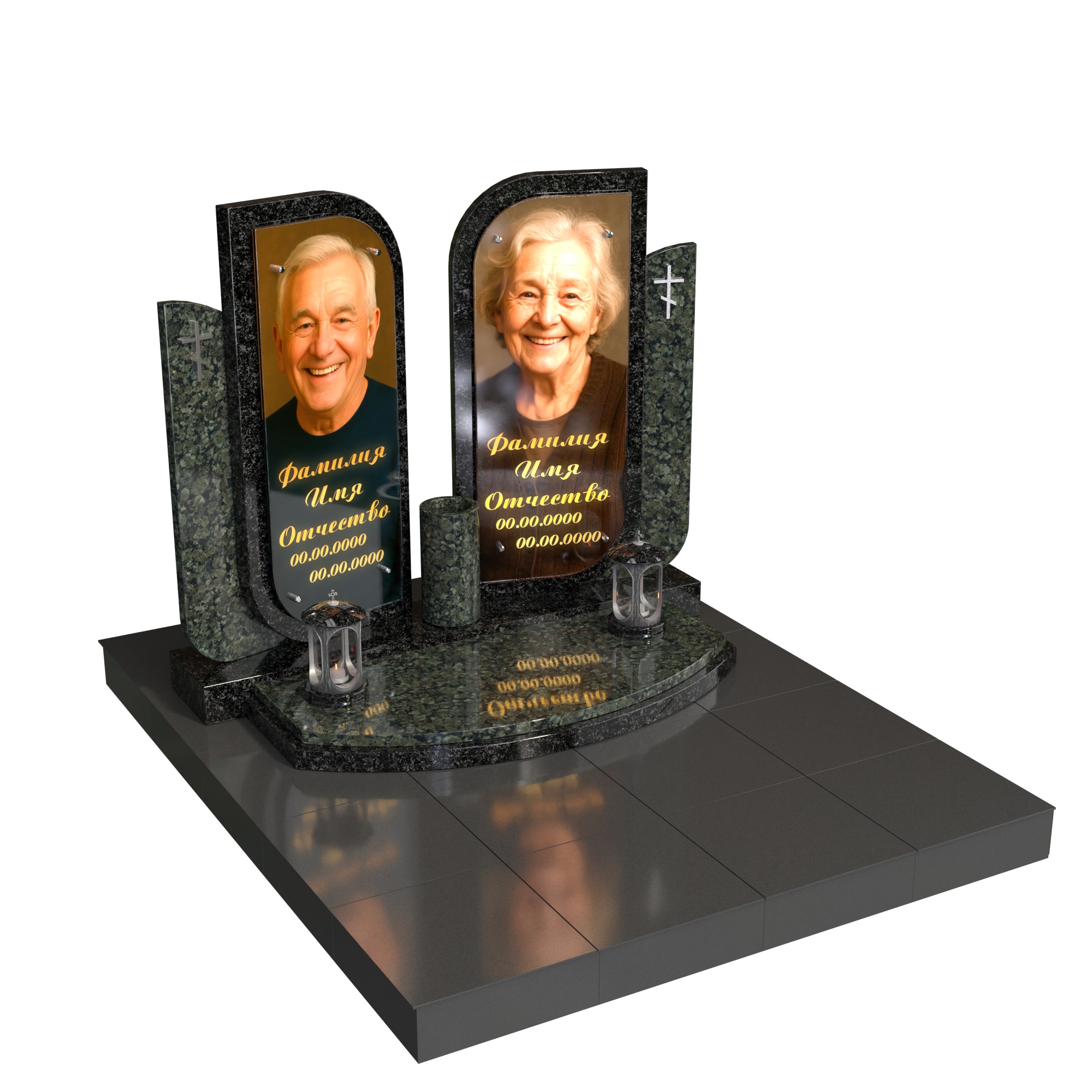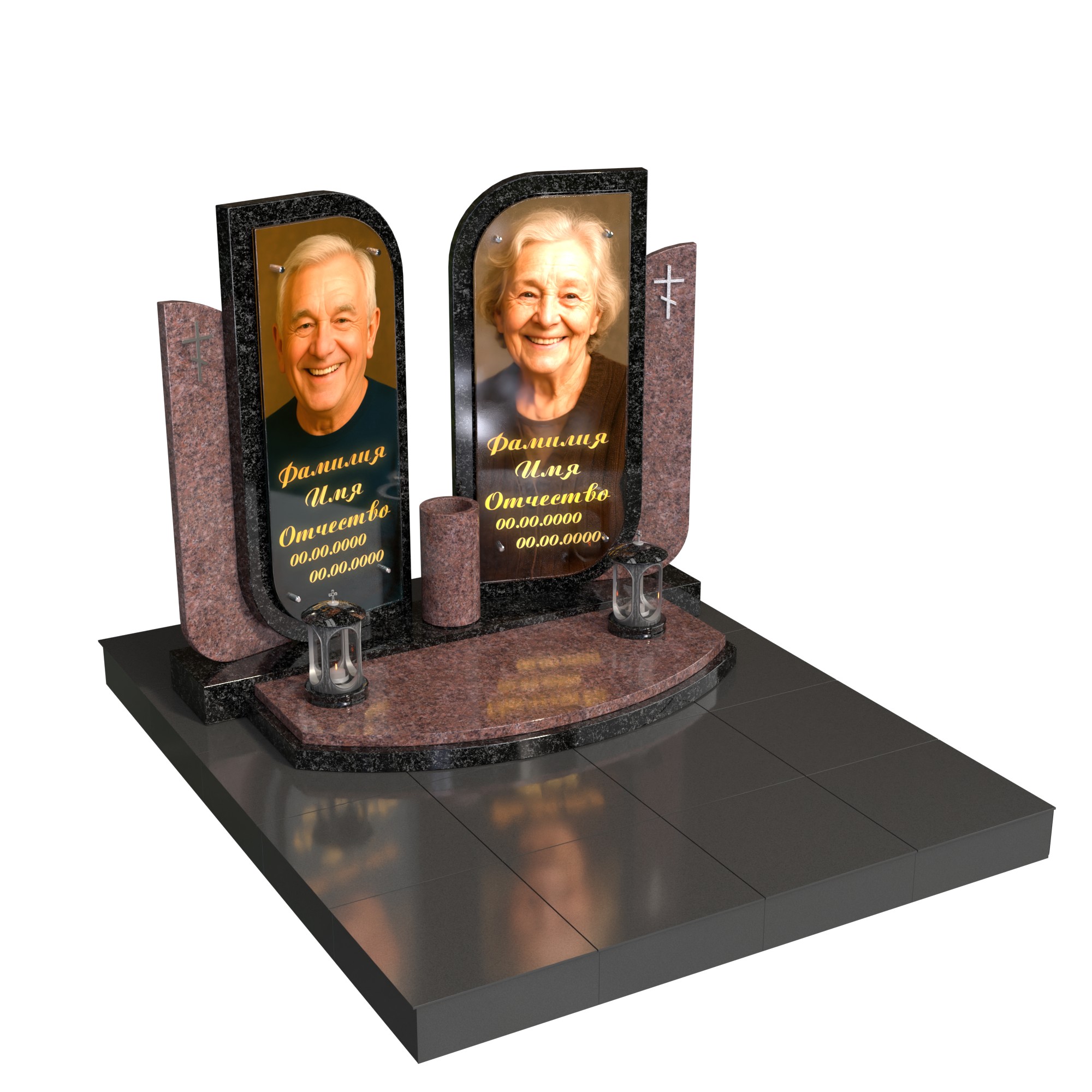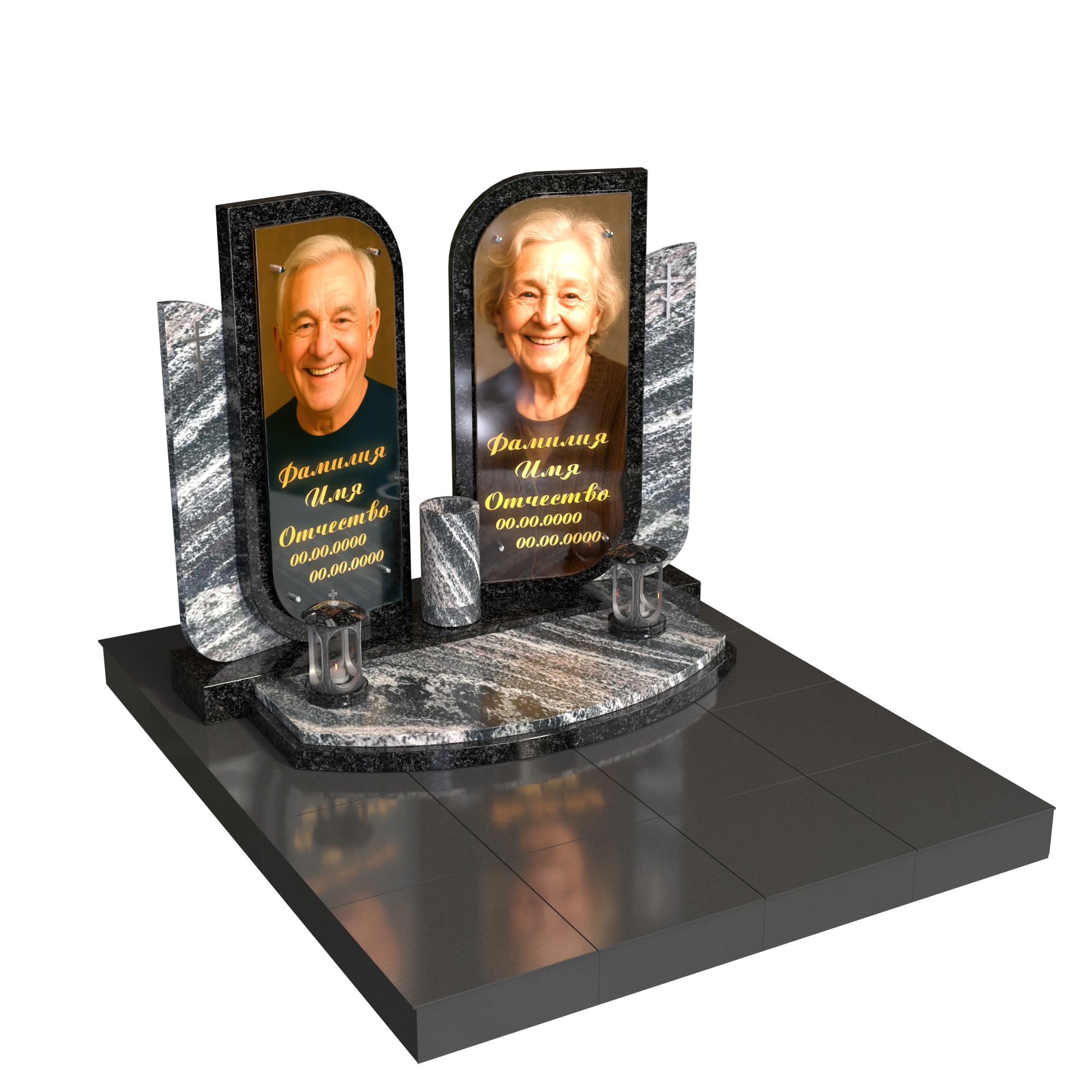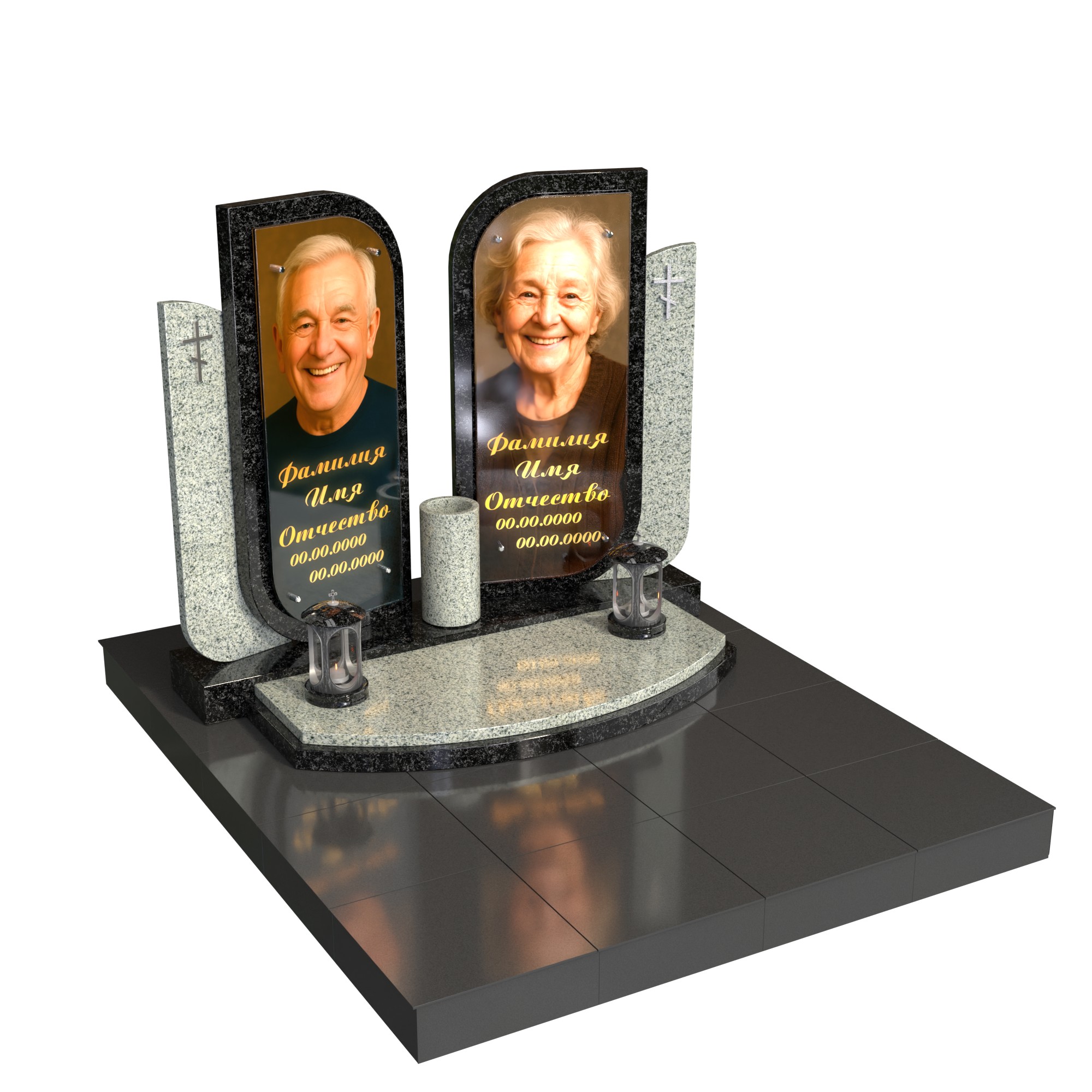 Парный памятник «Вечный союз» — современная модель для двух захоронений. Две симметричные стелы с мягко скруглёнными линиями образуют единую композицию, символизируя связь двух судеб. В каждой стеле — фотопортрет на стекле (крепление на метизах) и именная гравировка. Полукруглый подиум, центральная ваза и две лампады подчёркивают торжественность и завершённость комплекса; боковая плита с крестом усиливает духовный акцент.