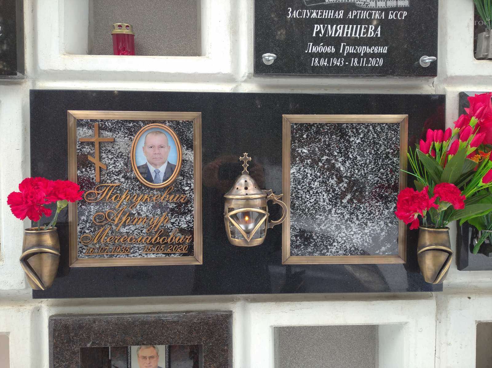 На колумбарной плите может размещаться портрет усопшего путём его гравирования либо монтажа медальона в рамке из бронзы или полимера.